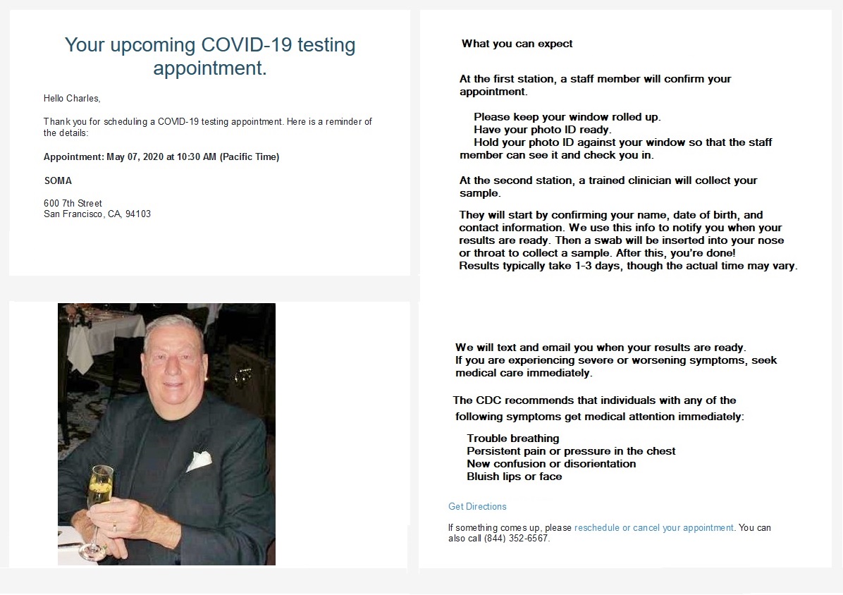 The purpose of this testing is to allow me to determine how to continue my new lifestyle in the City! Either way the test goes, it will be of interest to me and my friends! The testing was setup in a vacant parking lot with areas covered with asphalt, and the temperature was for San Francisco, very hot! About 75 degrees and no wind at all. The asphalt was baking and when I got there, about 20 people were in line already! It takes about three minutes a person so it took me about 45 minutes standing in the hot sun. I also walked over there and forgot how long the blocks are south of Market Street. From my apartment it was at least 1.2 miles! And the drive in area was full of cars winding down the street so a lot of City residence are out and about for COVID-19 testing, a good sign! The people working there were so pleasant and helpful. I decided I needed the exercise so I walked back to the high end Market grocery store across from where I live so another 1.2 miles, total of about 2.5 miles! So I will know the results in one to three days!