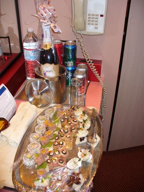 We had a nice lunch and then found a bottle of champagne in our room from our good friend Patti and a huge silver platter of snacks! Then we dressed for dinner in our best. Well the first night was casual so we decidednot to dress the next night but heard it was the captains dinner so we dressed up again!